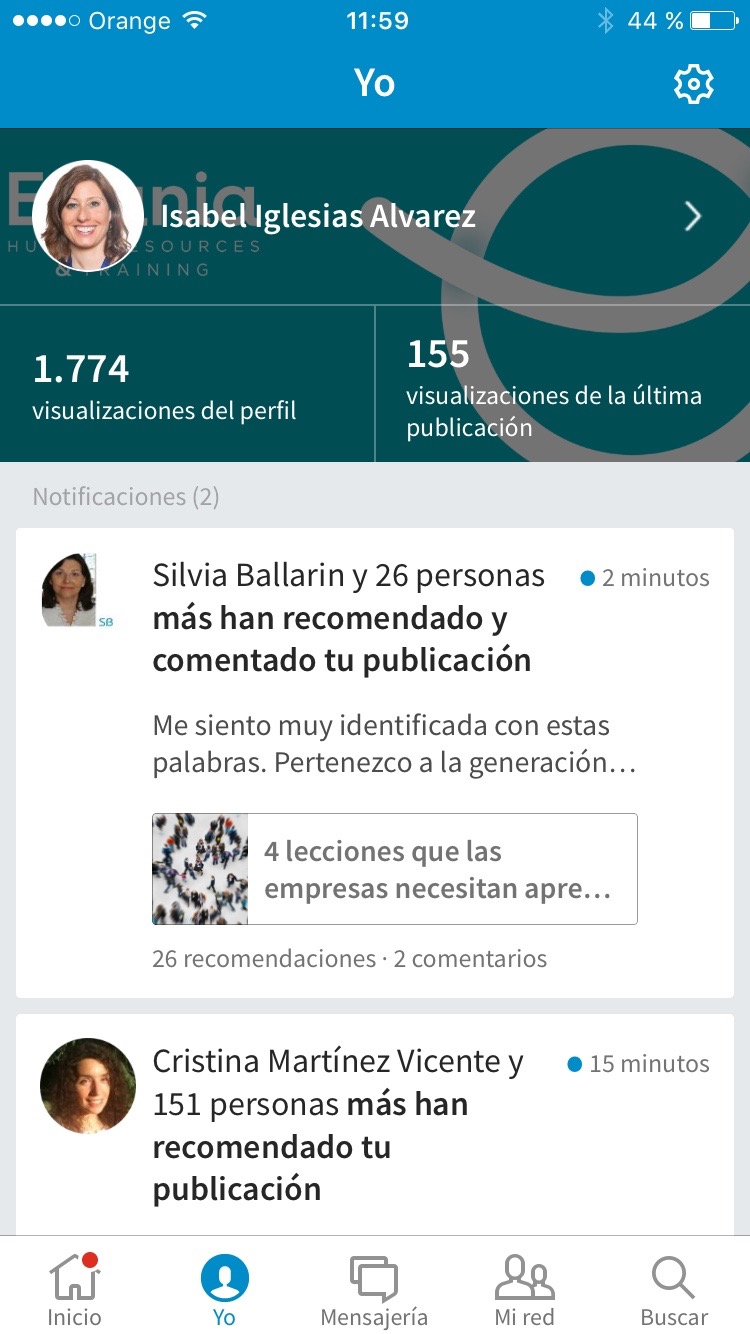 En esta pantalla de «Yo» podemos ver todas las notificaciones que hemos recibido ya sean de debates que hemos publicado como de otros en los que hemos participado. Es una manera sencilla de no perder la interacción con nuestra red de contactos y nos permite poder estar al día de forma instantánea cada vez que alguien nos menciona. De hecho LinkedIn nos ofrece incluso el dato de cuándo se ha hecho esa mención mediante los minutos que hace que nos han mencionado, dato que podemos visualizar en la parte derecha de la actualización y que nos aparecerá con un punto azul. En el momento en el que entramos a visualizar esa nueva notificación, ese punto azul desaparecerá con lo que es una manera de asegurarnos que no nos perdemos nada.