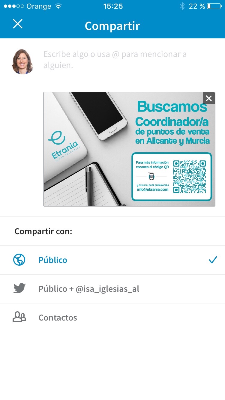 - Compartir actualizaciones y fotos de forma sencilla y rápida: Desde esa misma pantalla, LinkedIn nos ofrece la opción de poder compartir una actualización de dos maneras diferentes: una de ellas es mediante el icono que pone «compartir» donde podremos escribir lo que queramos, poner con quién queremos compartirlo, adjuntar un enlace o una foto. La segunda opción que nos brinda LinkedIn es compartir una foto que podremos elegir desde las que tengamos cargadas en nuestro móvil así como escribir algo de texto. Ya sabéis que desde hace algún tiempo, LinkedIn se ha vuelto mucho más visual que antes y ha faciltado mucho que podamos compartir imágenes de forma sencilla, tanto como actualización personal como en los grupos.