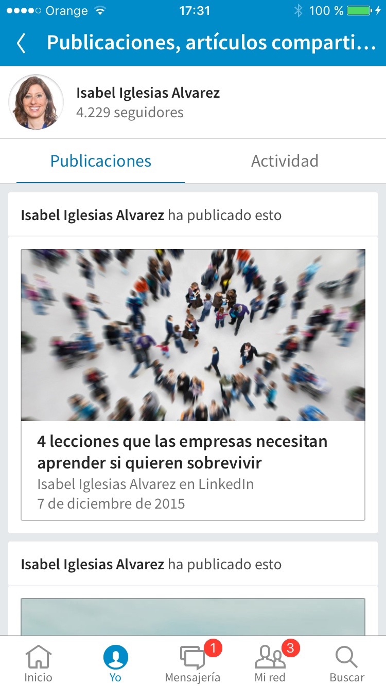 - La pestaña de «Yo» nos ofrece mucha más información interesante sobre nuestra actividad en LinkedIn. En la parte superior, junto a nuestra foto y nombre podemos entrar a ver nuestro perfil así como editarlo. Justo debajo, LinkedIn nos ofrece unas pequeñas estadísticas sobre las visualizaciones de nuestro perfil em los últimos 90 días, así como las últimas 5 personas que han entrado a verlo. Este es uno de los cambios que sí considero que hemos perdido en cuanto a informacion ya que con la nueva app no podremos ver, por ejemplo, el ranking de nuestro perfil comparado con perfiles como el nuestro o en la empresa en la que trabajamos. Todos esos datos sí se han mantenido en la opción web.
